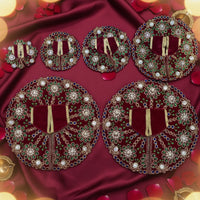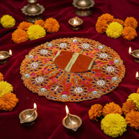 It features heavy stones, pearls, floral thread embroidery and zari detailing, giving it a luxurious divine appearance.